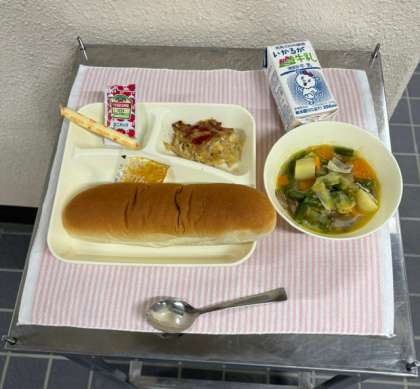 とうふローフは、ミートローフをイメージして作られた献立です。ケチャップ(袋)をかけて食べましょう。