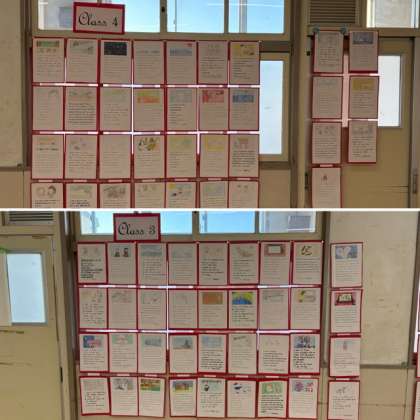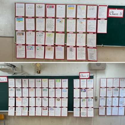 中館3階学習室では、英語絵日記を展示しました。夏休みの思い出を英語で書きました。