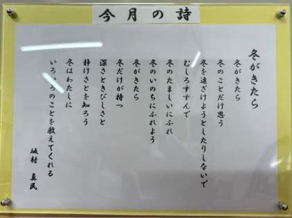 さて、今日から12月。季節は冬へと移り変わり、朝晩の空気もいっそう冷たくなってきました。校長室前の今月の詩は、坂村真民さんの「冬がきたら」です。