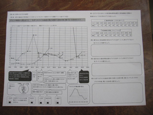 GDP、インフレーション率、原油価格の推移を示すグラフをもとに、国が一つの産業に依存することで生じる課題について、生徒たちは自分の考えを深めていきました。