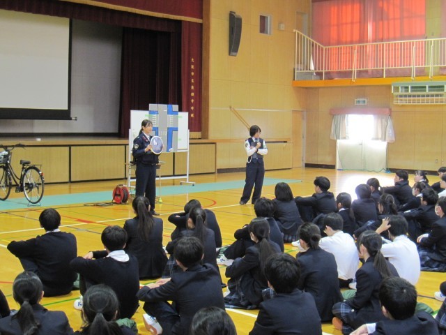 今回は、PTA役員の方々が企画してくださり、鶴見警察署より講師をお招きしました。自転車に乗る際の注意点や交通法規について、実例を交えながら丁寧にお話しいただき、生徒たちは真剣な表情で聞き入っていました。