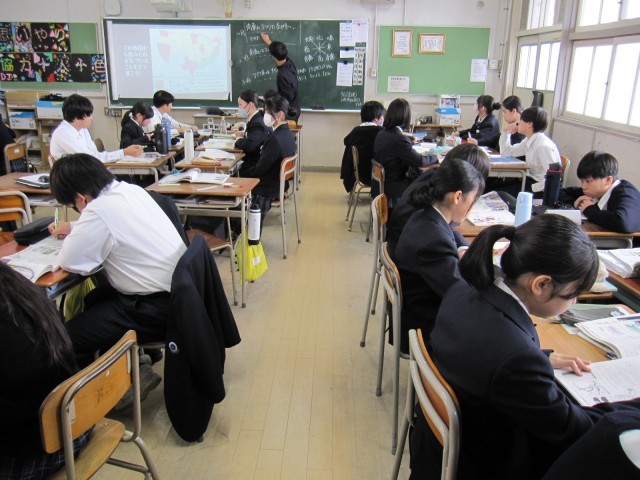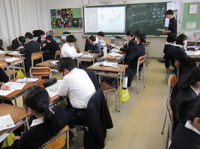 まずは複数の資料から個人で自分の考えをまとめ、その後グループで意見を交流しながら理解を深めていく授業でした。生徒たちは、資料をもとにした根拠ある考察に積極的に取り組んでいました。