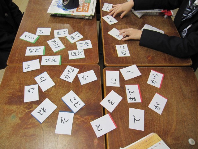 本時は、助詞の使い方について理解を深める授業でした。グループごとに助詞カードを配布し、文章中の( )に入る最も適切な助詞を話し合いながら考えていきました。