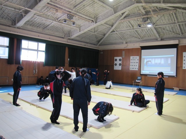 はじめに各技のポイントを確認しながら練習を行い、その後、班ごとにテストを実施しました。授業中はお手本となる動画が提示されており、生徒たちは動きの流れや姿勢のポイントを意識しながら、意欲的に練習に取り組んでいました。
