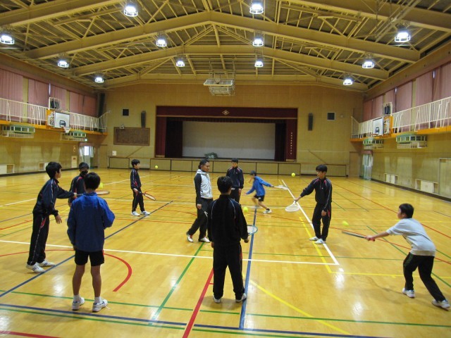 運動場の状態が悪かったため、会場を体育館に変更して実施しました。体育館では、ラケットの持ち方やボールの打ち方など、テニスの基本となる練習を中心に活動しました。