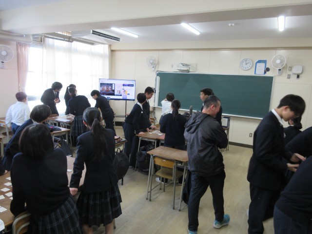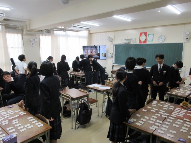 教室で班ごとに机を向かい合わせに並べて対戦形式で取り組みました。