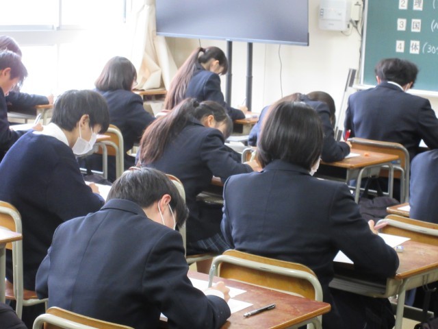 本日と明日の2日間、1・2年生は学年末テストに臨んでいます。学年の締めくくりとなる大切な定期テストです。これまでの学習の成果を発揮しようと、生徒たちは真剣な表情で問題に向き合っていました。