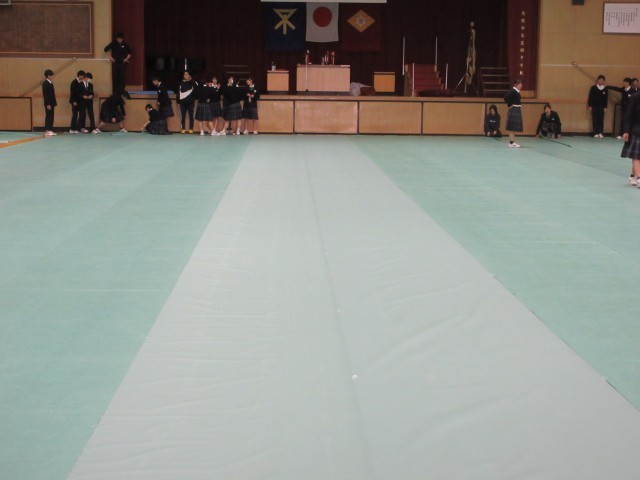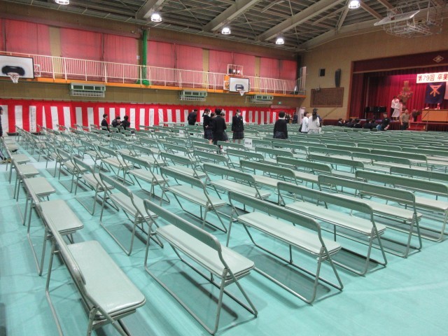 2年生は、体育館で式場の設営を担当しました。いすや演台の配置、紅白幕の準備などを協力して進め、卒業生の門出にふさわしい式場づくりに取り組みました。