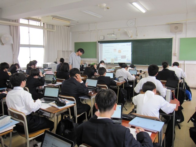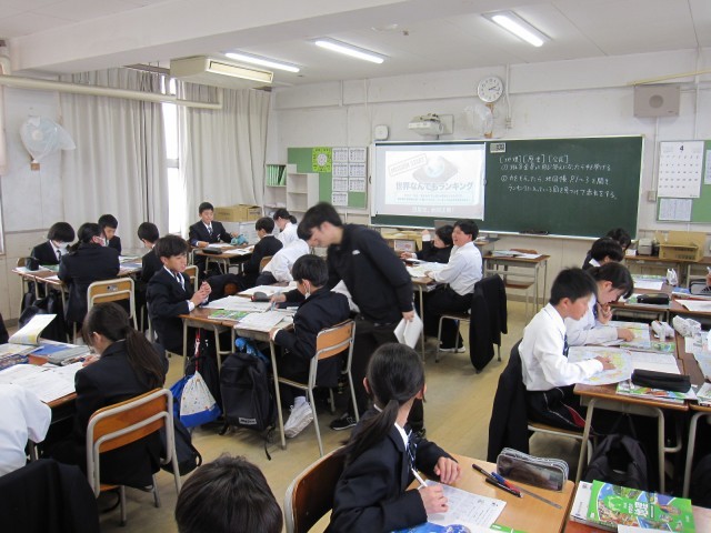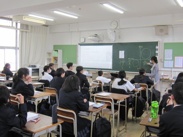 写真は、1年生の授業の様子です。入学して間もない1年生にとっては、中学校での初めての「授業」。やや緊張した表情を見せながらも、先生の話に真剣に耳を傾け、一生懸命に取り組む姿が印象的でした。