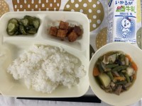 今日の給食は、ご飯豚肉と干しずいきのみそ煮五目汁焼きじゃが牛乳です。今日は干しず...