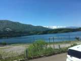 お土産・昼食会場から離れ、バスは大阪に向かっています。 途中の青木湖が山の雪と一...