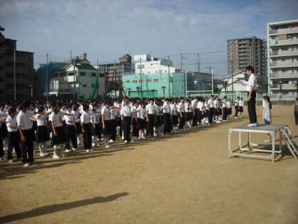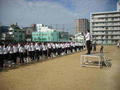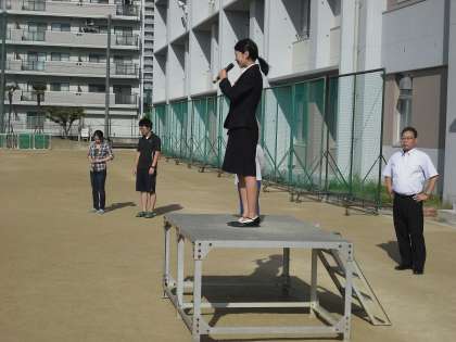 おはようございます。今日は校長先生が出張のため、先生が初めて全校集会でお話をさせてもらいます。先生が緑中学校に来たときの最初の印象は、「よく挨拶ができる学校」だなぁと感じました。朝、学校まで歩いてくる途中、いつもテニス部やラグビー部の人たちが遠くからでも挨拶をしてくれます。陸上部の人も外周を走って苦しい顔をしながらも挨拶をしてくれて、先生はすごく嬉しく感じました。職員室に入れば先生方も元気よく挨拶をしてくれます。先生は緑中学校に来て、改めて挨拶は人との関係を活発にしたり、相手に良い印象を与える大切なことだなぁと思いました。