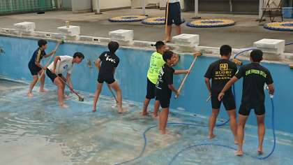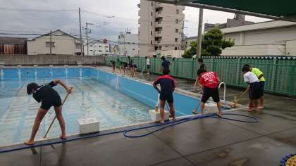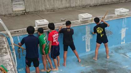ラグビー部の皆さんが、体育大会後に始まる水泳の授業のために、プール掃除をしてくれました。ラグビー部員らしい力のこもったブラシさばきでプールサイドや壁のしつこい汚れを落としてくれました。