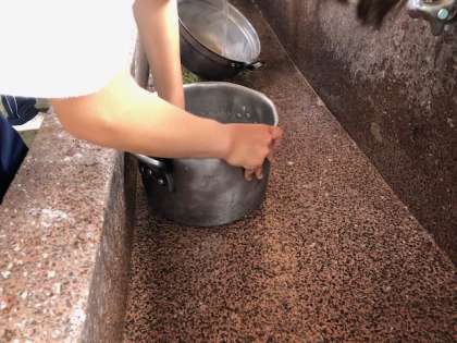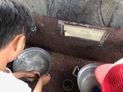ごちそうさまをした班から、後片づけに入っています。生徒たちは、一生懸命に洗っています。