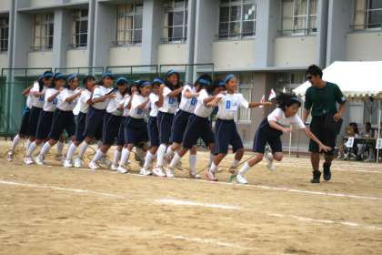 女子と男子に分かれてバトンをつなぎます。全体がひとつに息をあわせて一歩一歩ゴールを目指します。