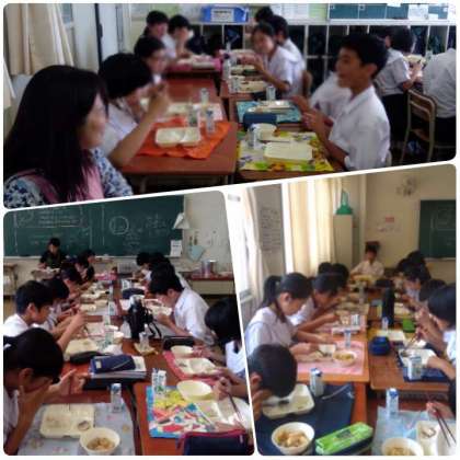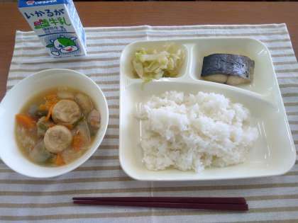 今日の給食は、さごしの塩焼き、じゃがいもと一口がんもの煮もの、キャベツのおひたし、ごはん、牛乳でした。感謝していただきました。