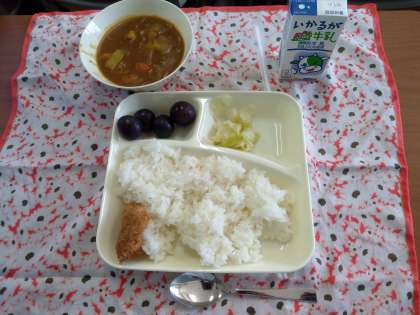 今日の給食の献立は、チキンカレーライス、一口ヒレカツ、キャベツのピクルス・巨峰、牛乳でした。感謝していただきました。