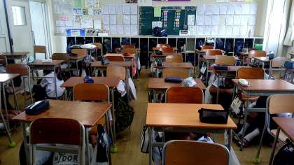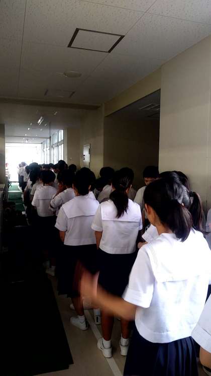 生徒全員が一旦グラウンドに集合した後、津波を想定し、4階に避難する予定でしたが、あいにくの雨のため、予定変更をしてグランドには集合せず、4階に避難する訓練になりました。