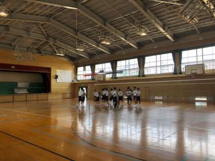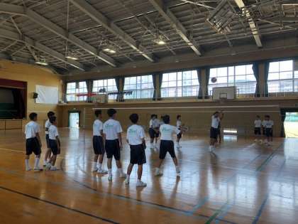 体育館で、バレーボールの授業をしています。スパイク練習です。スパイクは、きまりましたか?