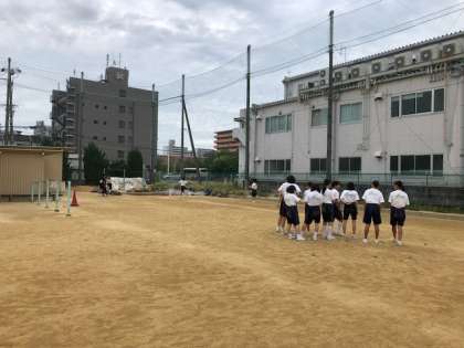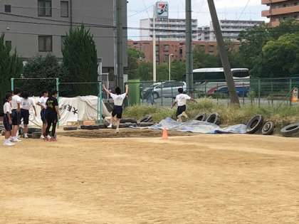 走り幅跳びの学習です。助走、踏切、空中動作、着地と練習して、ベスト記録を出してください。