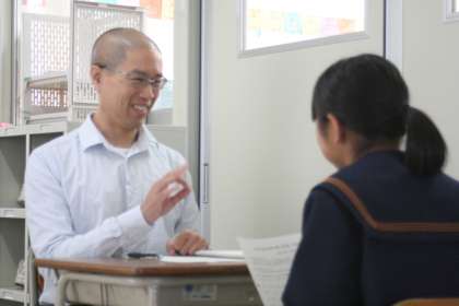 2時間目、2年3組では、C-netのエディ先生と一人ずつコミュニケーションを取る時間が設けられました。自分の番が回ってくるまで、他の生徒は英語スピーチ文の作成を行います。英語科の伊藤先生が質問のある生徒に対応しご指導されていました。先生方がチームになって生徒の指導にあたっています。