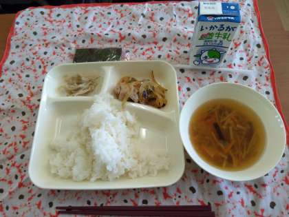 今日の献立は、鶏肉のごまだれ焼き、ソーキ汁、もやしのしょうがじょうゆあえ、焼きのり、ごはん、牛乳でした。