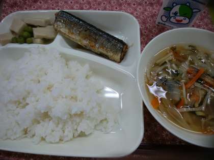 今日の給食献立は「さんまのさんしょう焼き、すまし汁、高野どうふの煮もの、ごはん、牛乳」でした。給食では「旬を知る」こともねらいのひとつです。そこで、毎年この時期には、秋の味覚、旬のさんまを味わいます。