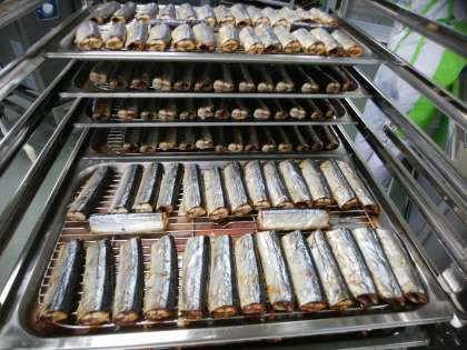 給食では一人60gの切り身に料理酒で下味をつけ、スチームコンベクションオーブンで蒸し焼きにした後、砂糖、みりん、こい口しょうゆ、山椒(粉末)を合わせたたれをかけました。