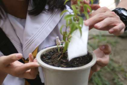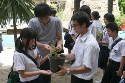 復興支援「緑のバトン」で育てていた中庭の苗木は、夏休みのあいだ生徒会の生徒が持ち帰り育てることになりました。強い日差しを受けて、たくましく育ったのちに被災地へ届けたいと思います。