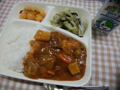 今日の給食は、ハヤシライス(米粉)、キャベツのひじきドレッシング、さくらんぼ(缶詰)、牛乳でした。