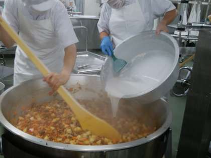 *給食のハヤシライスは、給食室で小麦粉をサラダ油やバターで褐色にいためて作ったブラウンルウでとろみを出しています。今回のハヤシライスは、アレルギー対応サポート月間ということで、水溶きにした米粉を使用してとろみをつけています。(写真:中)そのため、小麦アレルギーのある子どもたちに配慮した献立となっているとともに、油の使用量が少ないためにあっさりとした味わいとなっています。