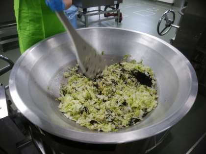 *蒸したキャベツにかける「ひじきドレッシング」は、もどして乾煎りした乾燥ひじきに、砂糖、塩、米酢、うす口しょうゆ、綿実油をあわせて作りました。(写真:下)カルシウム、食物繊維の豊富なひじきの「アッと驚く」使い方としておすすめです。ご家庭でもぜひ、お試しください。