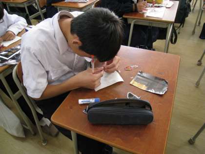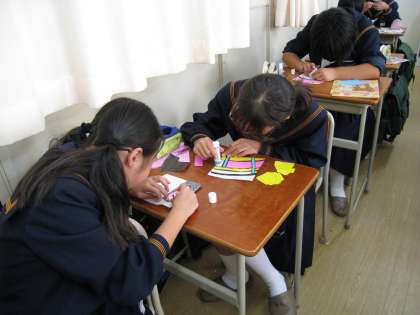 一辺15センチの正方形の紙に、決められた色の広告や雑誌を数ミリにちぎって貼っていき、それを貼り合わせて、1年生約200人で大きな絵や文字を完成させます。作品完成までには1人で最低2枚を作らないといけないので、なかなか大変な作業です。文化祭が今週の金曜日に近づいており、生徒の顔にも焦りや疲れの色が見えますが、完成まであと少しです。