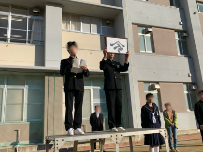 今日は全校集会で緑中「今年の漢字」の発表がありました。国語科の先生に協力していただき、たくさんの応募の中から選ばれたのは