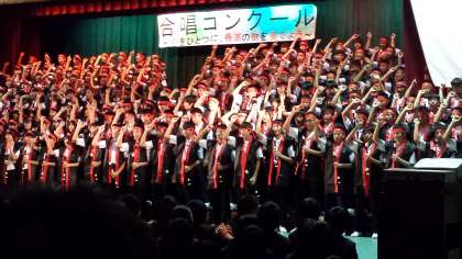 合唱コンクールでの受賞クラスの合唱が終わると、ハッピを着てハチマキをした2年生たちがあまちゃんのテーマ曲をリコーダーで奏でながら登場。さらに『暦の上ではディセンバー』の振り付けをしながらの合唱も披露されました。最後は合唱コンクールの課題曲『時の旅人』で、素晴らしいハーモニーを聞かせてくれました。