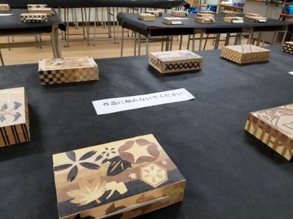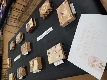 12月20日17時まで 3階習熟度教室にて美術科作品展を行っております。2年生の丁寧に仕上げられた切り絵作品『はがき箱』、3年生の美しいデザイン作品『扇子』を展示しています。また、1年生の工芸作品『お箸』は各階の掲示板に展示しております。