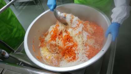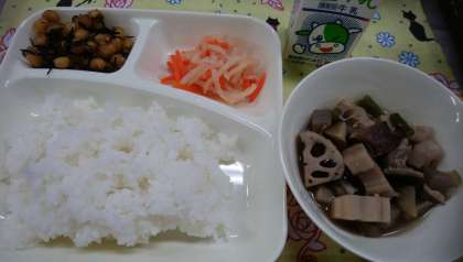 「紅白なます」は、にんじんの赤とだいこんの白でお祝いの水引を表現し、新年を祝うおせち料理の一品です。給食では、細切りにしたにんじんとだいこんをスチームコンベクションオーブンで蒸し、砂糖、塩、米酢、うすくちしょうゆで味つけしました。献立は、福岡県で正月によく食べられている郷土料理「筑前煮」と生徒に人気の「ひじき豆」を組み合わせました。
