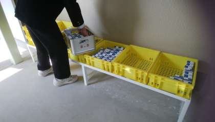 給食後、飲んだ後の牛乳パックは牛乳業者さんに回収していただきます。専用の箱にきちんと並べ替える作業は給食当番生徒の仕事です。今までは薄いマットの上に置いた箱に前かがみになって移し替えていましたが、低すぎて作業がしにくかったようです。