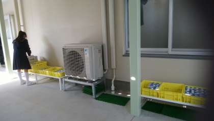 そこで、管理作業員さんが専用の置台を作ってくださいました。なんと、溶接してペンキを塗って、ピッタリサイズに仕上がっています。牛乳当番の生徒に聞くと「うわぁ、新しい台ができてるやん」「めっちゃ、やりやすくなった」と大好評でした。