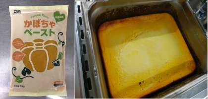 鶏卵(液卵)、かぼちゃ(ペースト)、牛乳、クリーム、砂糖を混ぜ合わせて、スチームコンベクションオーブンで蒸し焼きにしました。給食室ではバットの中心部まで十分に加熱ができているか、入念に確認をしていただきました。