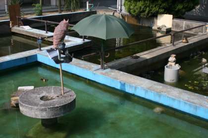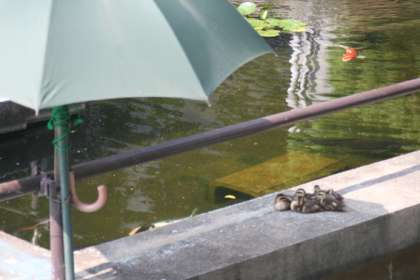 野球部による二日がかりの大清掃で、池はすっかりきれいになりました。池の中央に立てられた大きな雨傘に身を寄せたカルガモは、上手に直射日光をかわしています。本日も日差しが強くなってますので、体調管理にはくれぐれも気を付けてください。