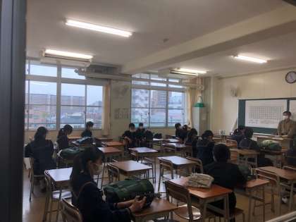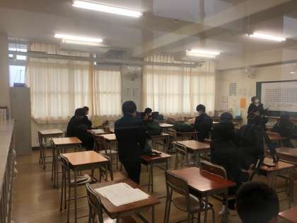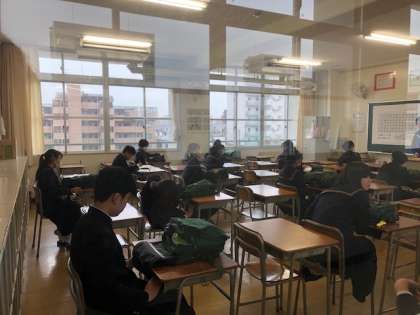 1年生と2年生の教室の14教室を使い、小人数態勢で学年末テスト、チャレンジテストの結果を返却しました。課題や休業中の諸注意も1年生と同様に行いました。