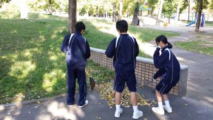 本日の5・6時間目に、一年生はクラスごとに分かれてコミュニティー広場や花博通り、鶴見神社周辺など、校区内の清掃を行いました。