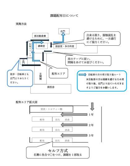 4月23日(木)・24日(金)に、5月6日までの学習課題を配付し、生徒が計画的に学習できるようにします。受け取りに関しては、保護者の方または生徒の来校をお願いします。保護者の方は自転車で来ていただいて構いませんが、生徒の場合は徒歩での来校をお願いします。この間に来校することができない場合は、個別に相談に応じますので、ご連絡ください。また、生徒だけの来校の際には、生徒が集団で行動しないようにご家庭でも注意喚起をお願いします。カバンの用意もお願いします。