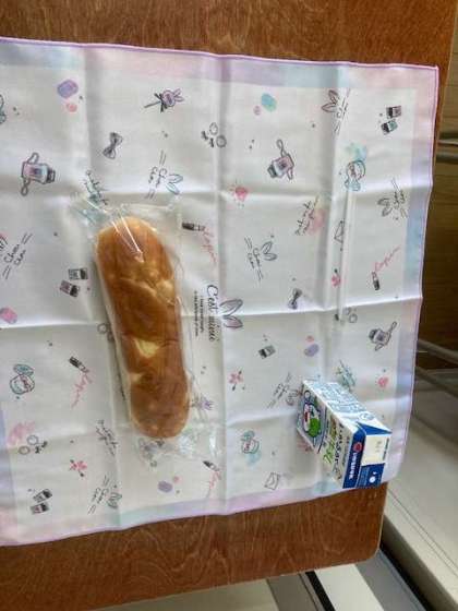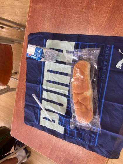 給食のパンと牛乳です。 本日は、サツマイモの「オサツパン」です。