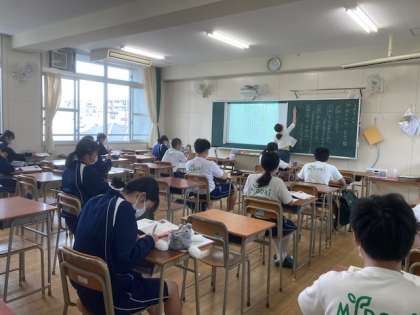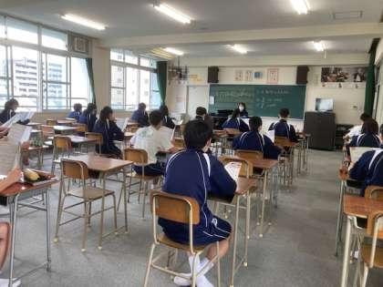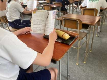 音楽室で、ピアノの伴奏を聴き、教科書の音階を確認しています。