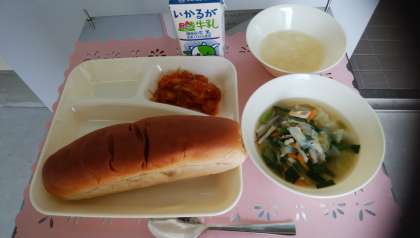 今日から通常授業になり、給食も3カ月半ぶりに通常献立での実施となりました。献立は「えびのチリソース、中華スープ、和なし(缶詰)、黒糖パン、牛乳」でした。