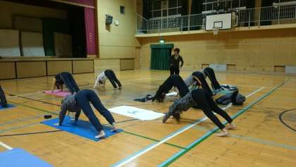 冬将軍到来で、体育館に着いた時には寒さで体がプルプル震えていましたが、バスケ部の練習後の整理体操に勝手に参加し、ヨガ前のウォーミングアップをさせてもらいました。