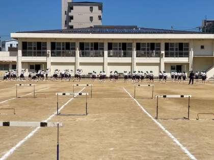 土曜授業の日に引き続き、男子は、ハードルの授業です。女子は、走幅跳の授業です。
