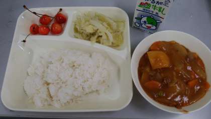 今日の献立は「ハヤシライス、キャベツのゆずドレッシング、さくらんぼ、牛乳」でした。
